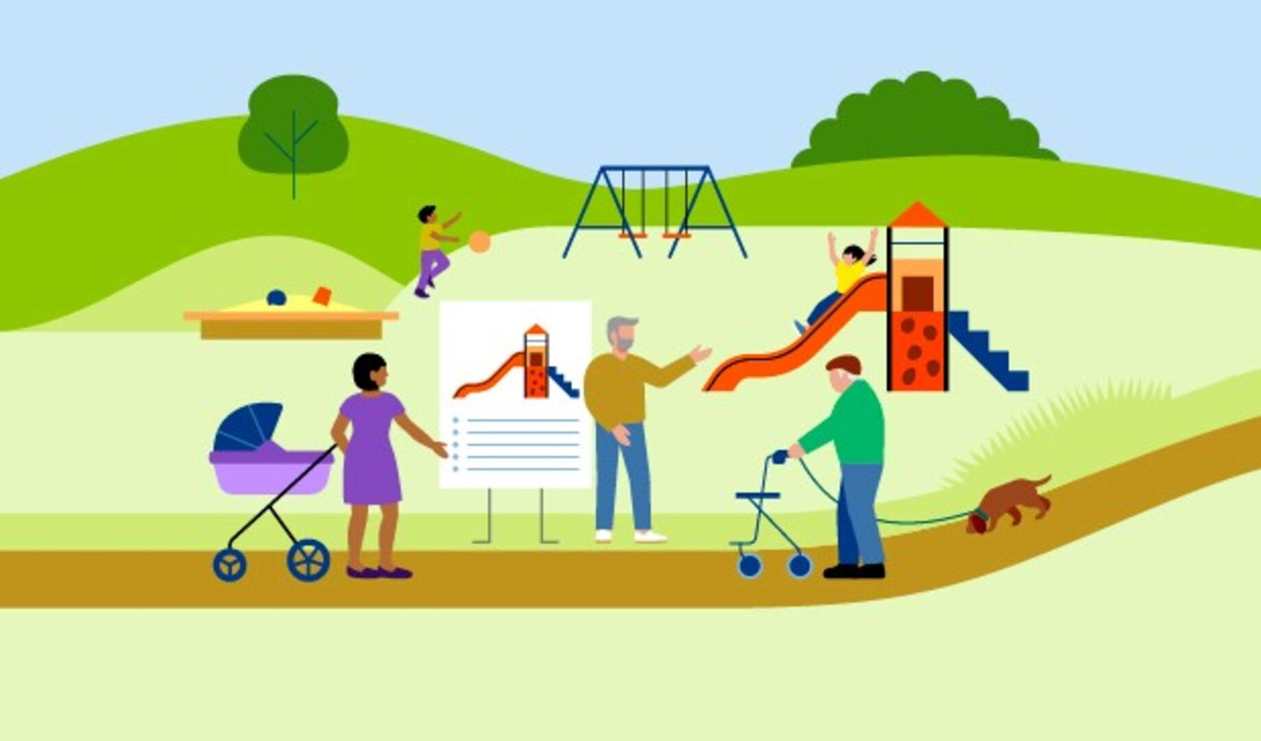 Der Spielplatz wird in verschiedene Zonen unterteilt, um eine gleichzeitige und konfliktfreie Nutzung durch unterschiedliche Altersgruppen zu ermöglichen. Neben einer multifunktionalen Ballspielwiese mit Jugendfußballtoren und Ballfangzäunen entstehen eine Calisthenics-Station für sportliche Aktivitäten, eine große Schaukel-Kombination sowie ein Sandspielbereich mit Spielkombination für Kleinkinder. Für ältere Kinder soll eine Kletter-Rutschen-Kombination errichtet werden. Sitzgelegenheiten, eine Tisch-Bank-Kombination und naturnahe Randbereiche mit abwechslungsreicher Bepflanzung runden das Angebot ab.